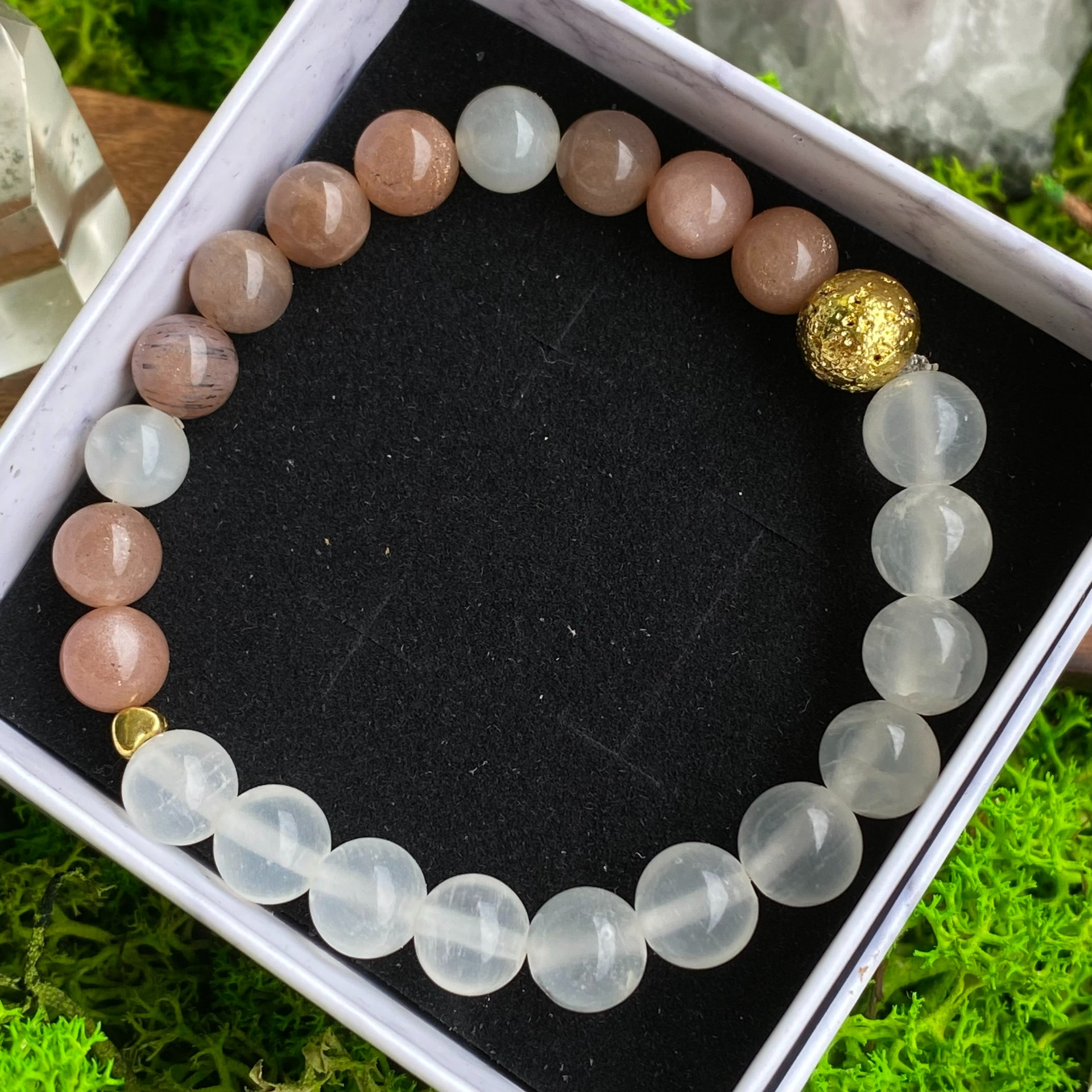 Vítej v prostoru spojení se měsíčním svitem a klidnou čistotou selenitu. Toto spojení nám přináší sílu intuice, jasnosti a duchovního poznání na naší cestě k osobnímu růstu.